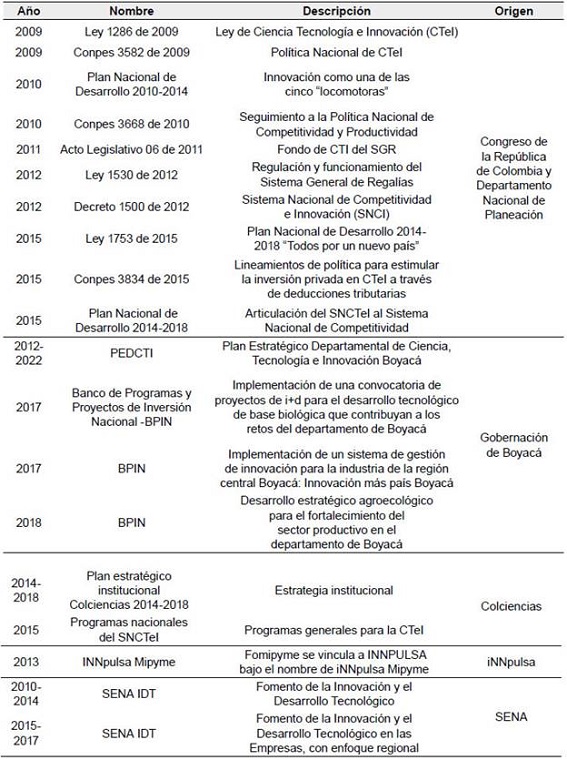 Colombia ha desarrollado instrumentos para impulsar la innovación a través de líneas de crédito y cofinanciación, además de las convocatorias públicas para empresas interesadas en aplicar internamente estos procesos y desarrollo tecnológico, por ejemplo, el Ministerio de Ciencia, Tecnología e Innovación (Minciencias) destina recursos no reembolsables a través de convocatorias para el fomento de la investigación y la innovación dentro de las empresas. El Sistema General de Regalías (SGR) destina el 10 % de los recursos para el Fondo de Ciencia, Tecnología e Innovación (FCTeI). INNpulsa Mipymes asigna recursos no reembolsables con la finalidad de fortalecer pequeñas y medianas empresas colombianas, y el Servicio Nacional de Aprendizaje (SENA) desde el año 2010 impulsa la innovación a través de la apertura de la convocatoria Fomento a la Innovación y el Desarrollo Tecnológico dentro de las empresas. Aunque el acceso de las empresas del departamento de Boyacá a este tipo de recursos es bajo, ha aumentado en los últimos años. Según la línea base de indicadores de ciencia y tecnología reportada por el Observatorio Colombiano de Ciencia y Tecnología (OCyT) entre 2008 y 2012 COLCIENCIAS financió 15 proyectos para Boyacá. Entre 2012 y 2015, el Fondo de Ciencia, Tecnología e Innovación aprobó cuatro proyectos por un monto de más de 57 000 millones (OCyT, 2017). De igual forma, INNpulsa ha asignado más de 1800 millones a proyectos formulados en el departamento de Boyacá y el SENA a través de la convocatoria IDT Boyacá pasó de tener dos proyectos financiados entre los años 2010 y 2014 a cinco entre 2016 y 2017.
