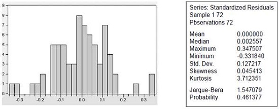 En consecuencia, la variable riesgo dejó de ser significativa dentro del modelo, por lo que se eliminó y se obtuvo el modelo presentado en la Tabla 4. A este modelo se le practicaron pruebas de diagnóstico de residuales para validar los supuestos de media, normalidad (Jarque-Bera) y de no correlación de los errores (Breush-Pagan), cumpliendo con todos ellos5.