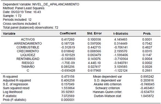 Para la presente investigación se llevó a cabo una estimación mediante la metodología de datos de panel a seis aerolíneas colombianas, para los periodos semestrales comprendidos entre 2012 y 2017, con el fin de validar si las variables explicativas propuestas determinan el nivel de apalancamiento de las empresas. Se recurre al método de regresión de datos de panel, debido a que permite combinar dos dimensiones: tiempo y agentes económicos, también denominadas dimensión temporal y estructural. Utilizar esta técnica tiene una serie de ventajas en comparación con los modelos de series de tiempo y de corte transversal (Baronio & Vianco, 2014):
