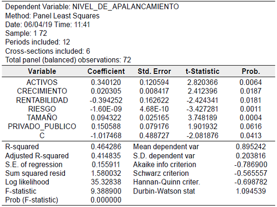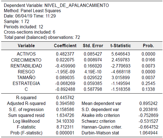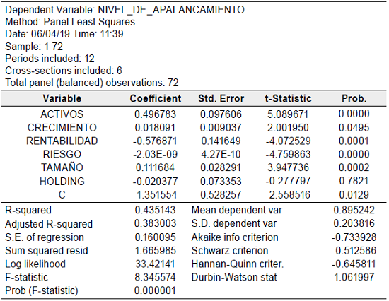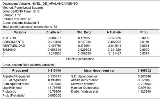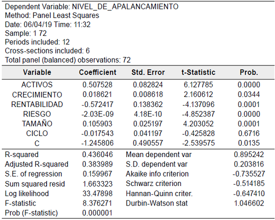 De este modelo se puede inferir que el nivel de apalancamiento es explicado en un 61.04 % por la estructura de los activos, el crecimiento, la rentabilidad operacional y el tamaño de la compañía. Parte de las variaciones del nivel de apalancamiento no puede ser explicado en un 38.96 % por estas variables.