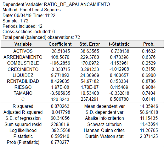 Luego de una primera estimación mediante el método de MCO, el arrendamiento no es significativo, pues puede ser considerado como un sustituto de la deuda, tal como lo demuestra Erickson y Trevino (1994) en su investigación sobre los determinantes del arrendamiento, en el cual las empresas de acuerdo con el tipo de arrendamiento, ya sea financiero u operativo, pueden no afectar el nivel de endeudamiento de la compañía. De igual manera, el combustible no resulta ser un factor determinante en el nivel de apalancamiento, pero sí en sus utilidades. En cuanto al indicador de liquidez, si bien las empresas buscan mantenerlo en el tiempo, estadísticamente no tiene significancia al momento de determinar el nivel de apalancamiento de estas.
