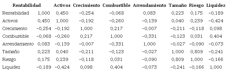 En la Tabla 1 se muestra la matriz de correlaciones de las variables regreso-ras, en donde a priori se observa que no hay evidencia de correlación fuerte entre las variables, a excepción del tamaño y el riesgo que tienen una correlación lineal positiva de 0.80; además, se observa que no existe relación lineal entre el arrendamiento y el crecimiento al tener una correlación de 0.007. Para analizar si existen problemas de multicolinealidad se acude al determinante de la matriz de correlaciones, el cual es de 0,07648, es decir, que basado en el determinante no se observa una señal de multicolinealidad.