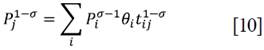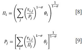 [8] and [9] can be solved for all ϖ’Is and P’js in terms of income shares, bilateral trade barriers and σ. It is assumed that the trade costs between i and j are symmetric, thus, тi,j = тj,i . Under symmetry it can be verified that a solution for [8] and [9] is ϖ¡ = Pj with