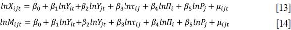 xij, and Mij represent the exports and imports of country i in year t; Y¡ and Yj are the GDP of the exporting and importing country, respectively. Tij, represents trade costs between countries, and µij is the random error term. The terms β are the coefficients to be estimated, being the term β0 a constant of the regression.