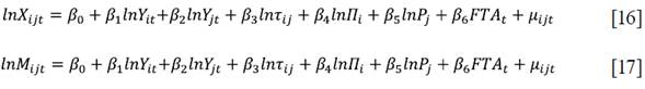 The variables from b2 to b4 of equation 15 are Dummies16 indicating countries with a common language, countries with colonial ties and landlocked countries, respectively. Also, to evaluate the impact of free trade agreements, the variable FTA is included in the equation. In effect, the equations to be estimated are17: