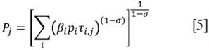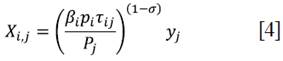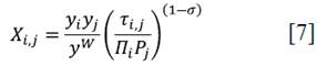 Pi,J is the price in the country j from the good produced in i, including the price of the good with factory costs (and the commercial costs between i and j (тi,j ). And yj represents the nominal income of the residents of the country j.