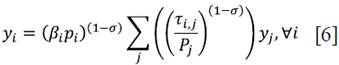 The nominal value of exports from i to j is Xi,j= Pi,jCi,j. And the income of country i must be equal to yi= Σj x¡,j . The nominal demand of the good of the region i by consumers in region j is given by: