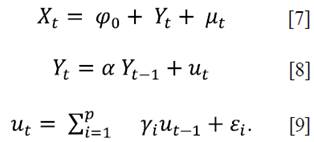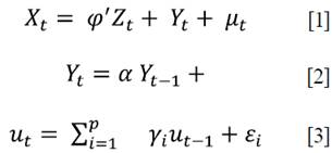 Donde Xt es la variable observable, Yt es un proceso autorregresivo no observable, Zt es un vector p X 1 de términos determinísticos conocidos (constante y/o tendencia), φ es un vector fijo conformable con Zt y µt representa el componente no observable de cambios de nivel. De Ut se supone que es estable. y