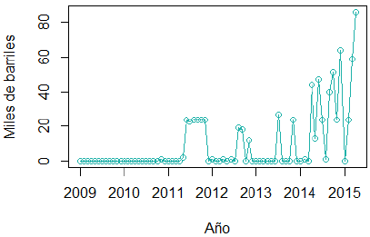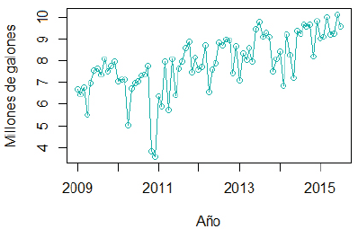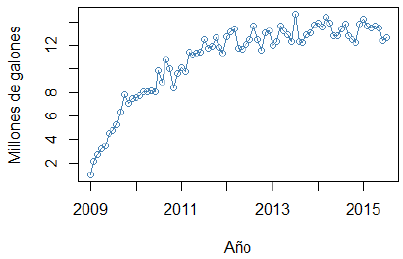 En la Figura 1 puede observarse cómo la producción de biodiésel mantuvo una tendencia creciente desde 2009, el año posterior al inicio del programa de mezcla, hasta enero de 2015, con una producción máxima de 14,64 millones de galones en julio de 2013. Sin embargo, tal crecimiento se presentó de una manera más notoria entre los años 2009-2012, en parte, gracias a las medidas implementadas por el Ministerio de Minas y Energía para promover la producción del biodiésel, y a la entrada en funcionamiento de nuevas plantas productoras (DANE, 2016).