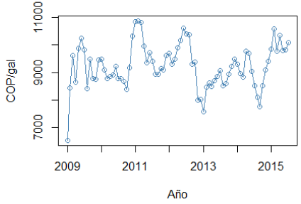 Al iniciar el análisis del comportamiento de la serie, se puede observar cómo a inicios del año 2009 se presentan unos niveles bajos en el precio del biodiésel en comparación con el resto de los años analizados, y esto ocurrió básicamente debido a los descensos en el precio internacional de la palma de aceite, con una disminución en el precio del 61 % entre marzo y noviembre de 2008. Estos precios del biocombustible empiezan a tener una recuperación a partir de marzo de 2009 y mantienen cierta estabilidad hasta noviembre de 2010 con un precio promedio aproximado de 9100 pesos por galón; sin embargo, para diciembre de 2010 los precios en los mercados internacionales de la palma de aceite sufren una fuerte alza hasta alcanzar un nivel de 10 300 pesos por galón, continuando con una leve fluctuación hasta finales del año 2012, cuando se presenta una tendencia a la baja de los precios, debida al dinamismo de producción de aceite de palma y soya en el Sudeste Asiático. Para noviembre de 2012, el Ministerio de Minas y Energía, mediante Resolución 91664, aumentó el porcentaje de mezclas de biocombustibles para uso en motores diésel a un 8 % en la ciudad de Bogotá, el centro del país y los Llanos Orientales.