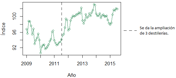 La situación anterior se refleja en la tendencia decreciente hacia 2009, como puede apreciarse en la Figura 6. Con respecto al año 2010, se empieza a ver una recuperación de dicho índice debido al crecimiento del sector azucarero registrado durante los primeros meses del año, y a la acumulación de cosechas presentadas para finales del año. De igual forma, las condiciones climáticas adversas que se dieron al final del 2010 ocasionaron reducciones en la cosecha de la caña de azúcar, lo cual se vio reflejado en la disminución del índice durante los primeros meses de 2011; sin embargo, estos efectos se fueron superando gradualmente, también gracias a que para el segundo semestre del año 2011 se hicieron efectivas una serie de inversiones que permitieron la ampliación en 200 000 litros de etanol en las destilerías de los ingenios Mayagüez, Providencia e Incauca.