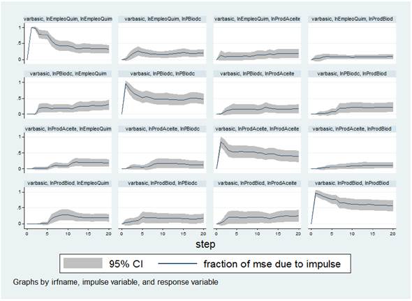 A efectos de evaluar la respuesta generalizada de un choque en diversas variables que afectan el empleo, se presentan los resultados de las funciones impulso-respuesta tanto del sector de producción de etanol como de biodiésel. El efecto se calcula para 12 y 24 meses adelante (solo reportamos la de 24 meses). En las figuras 8 y 9 se muestran las simulaciones de un choque positivo, exactamente de una desviación estándar, sobre el nivel de producción de biodiésel y/o etanol, en nivel de producción de azúcar y etanol, así como un choque de la misma magnitud en niveles de precios de biodiésel, niveles de producción de aceite de palma y biodiésel. Los resultados indican que modificar la normativa de mezcla obligatoria llevaría a un incremento del empleo que, en apariencia, es transitorio. Sin embargo, su efecto no es muy apreciable y, por el contrario, se diluye rápidamente en el tiempo. Esto es consistente con la metodología empleada, en la cual todas las variables son estacionarias con cambio de nivel, y por lo tanto, las correlaciones dinámicas proceden de un proceso vectorial estable, es decir, de vectores autorregresivos estacionarios en covarianza.