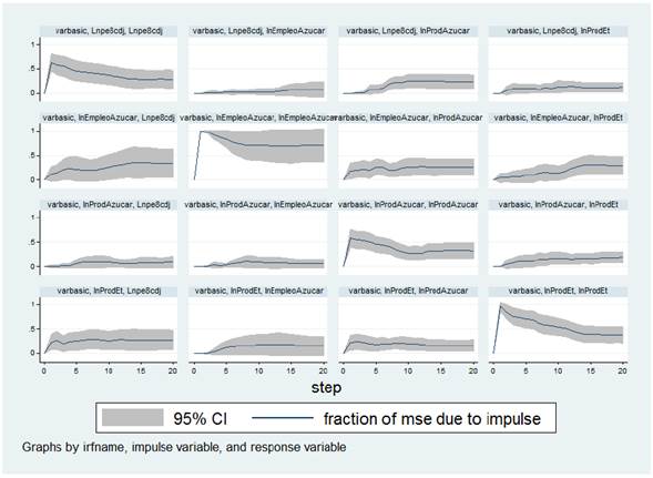 El efecto en cadena recogido por la expresión [12] representa la elasticidad Xt y empleo de corto o mediano plazo que, aunque es móvil, prevalece en t = 1,2,3,...., s. Donde Xt es cualquiera de las variables a la que se le produce un choque positivo (normalmente medido en desviaciones estándar), como por ejemplo la producción de etanol o biodiésel, los precios, etc. Así, el análisis de series de tiempo multivariadas es un instrumento riguroso para modelar variables que están correlacionadas en el tiempo, a diferencia de los modelos univariados que no permiten dicho análisis.
