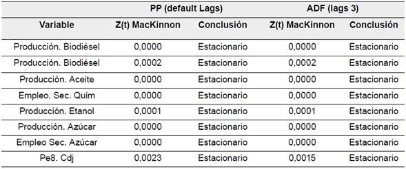 Como efectivamente ocurre en este estudio, muchas de las variables involucradas (en especial la producción de biocombustible y sus precios) presentan cambios de nivel que afectan el desempeño del contraste, lo que hace más probable que no se rechace la hipótesis nula de paseo aleatorio o no estacionariedad.