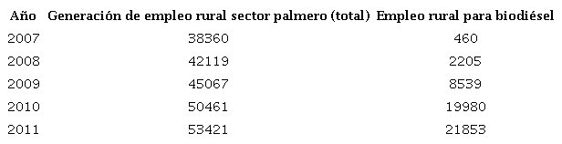 La Gerencia Privada PTP (2012) hace sus estimaciones de empleo generados por el sector del biodiésel y, como se muestra en la evolución de los datos históricos Tabla 1, se encuentra que para 2011 el cultivo de palma dedicado al sector del biodiésel generó 21 853 empleos directos; 43 000 empleos indirectos y 80 000 personas beneficiadas por las actividades relacionadas con el cultivo, extracción y producción de biodiésel (citada por FEDESARROLLO, 2012).