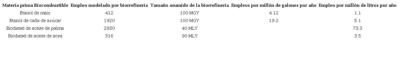 La Tabla 2 muestra los diferentes cálculos del número de puestos de trabajo por millón de litros producido en un año, basados en modelos de biocombustibles de primera generación: