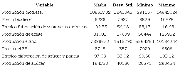 En la Tabla 3 se presenta la información estadística empleada en la aplicación de la metodología empírica. Se incluyen 79 observaciones mensuales tanto de variables endógenas como exógenas. Por su parte, tanto la producción de biodiésel como la producción de etanol se encuentran medidas en galones, y la fuente consultada para ello fue el Sistema de Información de Petróleo y Gas (SIPG); el precio del biodiésel y de la gasolina con mezclas de etanol del 8 % (E8) se encuentran en pesos constantes indexados por el IPP con base en el año 2014, tomando como fuente la información suministrada en la página de FEDEBIOCOMBUSTIBLES; la producción de azúcar se mide en toneladas y la fuente consultada fue ASOCAÑA (2016); la producción de aceite de palma se mide en toneladas y la información se encuentra en el Sistema de Información Estadística del Sector Palmero (SISPA); por último, el índice de empleo en la fabricación de sustancias químicas básicas, y sus productos (en donde se incluye el empleo del biodiésel) se encuentra referenciado en la versión 4 del código CIIU con el catálogo 2010 de la Encuesta Mensual Manufacturera (EMM) elaborada por el Departamento Nacional de Estadística (DANE), teniendo en cuenta que a partir del 2014 se desestacionaliza la serie; y el índice de empleo en la elaboración de azúcar y panela se encuentra referenciado en el código CIIU 1070 de la EMM (DANE, 2019).