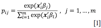 En donde pij es la probabilidad de que el individuo i escoja la alternativa j condicional a un conjunto de variables explicativas, Xi es la matriz de variables explicativas y j es el número de categorías que van de 1 a m. En este modelo, la probabilidad pij se encuentra entre 0 y 1 y