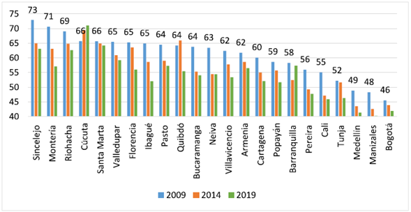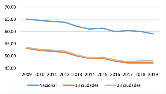 En el ámbito local, en la Figura 2 se presenta la evolución de las tasas de informalidad para las 23 ciudades y áreas metropolitanas más importantes del país consideradas en la GEIH durante el periodo estudiado. Esta figura muestra que existe una gran disparidad entre ciudades con relación a sus niveles de informalidad. Para el 2009, las tasas de informalidad más altas se presentaban en Sincelejo, Montería y Riohacha, en donde el porcentaje de trabajadores informales superaba el 69 %. Este resultado concuerda con lo reportado por Galvis y Pérez (2015) y Galvis et al. (2019).