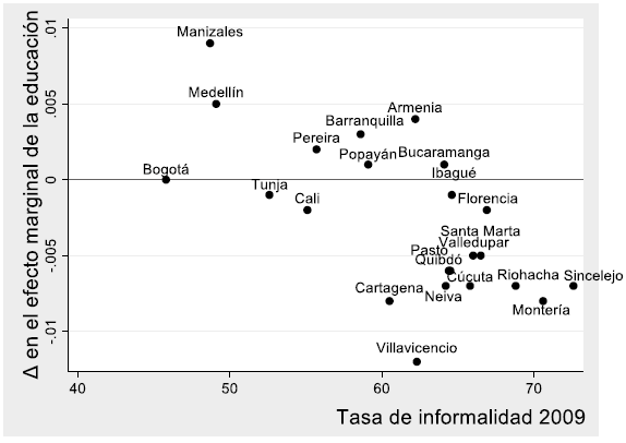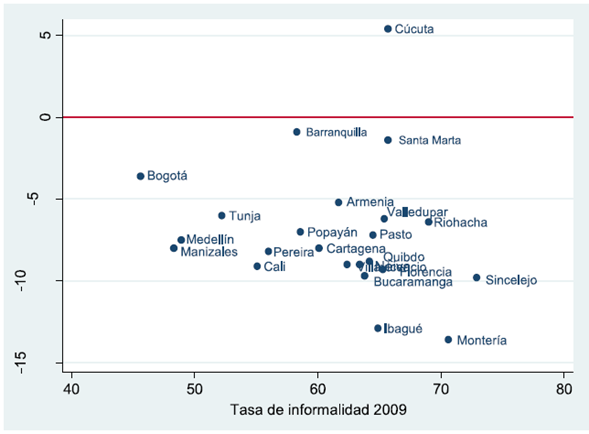 Los resultados indican que la tasa de informalidad a nivel nacional y por ciudades disminuyó durante el periodo estudiado, excepto para Cúcuta. Las tasas de informalidad más altas al principio del periodo se presentaban en Sincelejo, Montería y Riohacha, en donde el porcentaje de trabajadores informales superaba el 69 %. En contraste, en ciudades como Bogotá Manizales y Medellín dicho porcentaje no alcanzaba a la mitad de sus trabajadores en el mismo año. Durante el periodo analizado, la informalidad cayó, en general, más para las ciudades que presentaron los mayores indicadores en 2009 que para ciudades que iniciaron con menores tasas. Esto se traduce en una disminución de la brecha regional, aunque en términos absolutos las diferencias en tasa de informalidad entre ciudades siguen siendo altas.