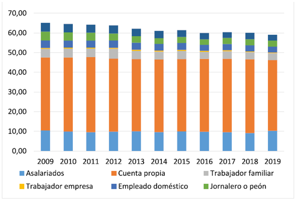 Una de las principales características de la evolución del empleo informal en términos de su composición es la poca variabilidad del grupo de informales con empleo por cuenta propia y asalariados, por un lado, y la leve reducción en las categorías con menor participación en el total de informales, por otro. La Figura 4 muestra claramente que la composición del empleo informal no ha sufrido grandes cambios a nivel nacional durante el periodo 2009-2019. La caída en el grado de informalidad a nivel nacional y la poca variabilidad en las grandes categorías de la informalidad a nivel nacional podrían explicarse porque los cambios en el ámbito de la ciudad se anulan al agregarse los indicadores.