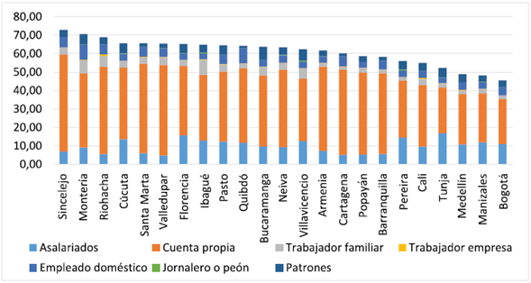 Para analizar el comportamiento en las ciudades, en la Figura 5 se presenta la composición del empleo informal en 2009. Como se observa, en el ámbito local existen diferencias marcadas en términos de composición de los informales entre ciudades con altas y bajas tasas de informalidad. Por ejemplo, en ciudades con altos niveles de informalidad como Sincelejo, el grupo de trabajadores por cuenta propia tiene una gran participación, mientras que en ciudades con bajos niveles como Bogotá, dicha participación es menor.