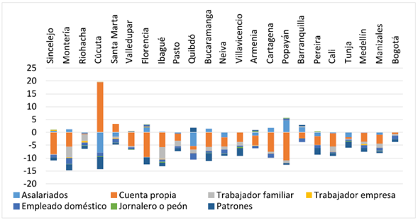 Con relación a la composición de la informalidad, los resultados sugieren que el empleo cuenta propia es la principal fuente de empleo informal en Colombia. Durante el periodo se observa una baja variabilidad en la composición del empleo informal. La caída en el nivel de informalidad a nivel nacional y la poca variabilidad en las grandes categorías de la informalidad a nivel nacional reflejaría un efecto de compensación en los indicadores de las ciudades al agregarse. En las ciudades, los factores asociados a la caída en la informalidad son heterogéneos y no siguen un patrón específico. Para algunas ciudades como Sincelejo, Florencia, Cartagena y Popayán la categoría cuenta propia fue determinante en tal reducción, mientras que en Montería, Riohacha, Ibagué, Quibdó, Villavicencio, Pereira, Tunja y Bogotá las caídas se explican más por los cambios en los grupos de asalariados, empleados domésticos y trabajadores familiares sin remuneración.