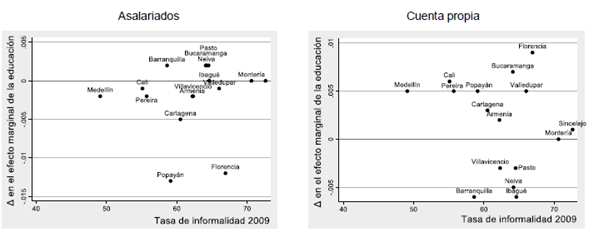 En cualquier caso, el nivel educativo y la informalidad guardan una relación no lineal; la reducción en el riesgo de informalidad frente al cambio marginal en los años de educación es mucho más grande cuanto mayor sea el nivel educativo que tiene la persona. Curiosamente, Salinas et al. (2012) encuentran que, para los asalariados la probabilidad de informalidad decrece con la educación, mientras que para los cuenta propia esa probabilidad se incrementa con la educación. Como explicación argumentan que los informales menos educados tienden a trabajar como asalariados y los informales con mayor cualificación trabajan mayoritariamente por cuenta propia.
