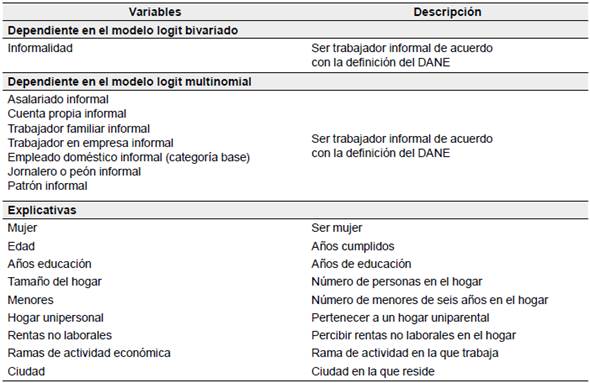 En Colombia la medición de la informalidad es realizada por el DANE, el cual define como trabajador informal a i) los empleados particulares y los obreros que trabajan en establecimientos, negocios o empresas que ocupen hasta cinco personas en todas sus agencias y sucursales, incluyendo al patrono y/o socio; ii) los trabajadores familiares sin remuneración; iii) los trabajadores sin remuneración en empresas o negocios de otros hogares; iv) los empleados domésticos; v) los jornaleros o peones; vi) los trabajadores por cuenta propia que laboran en establecimientos hasta cinco personas (excepto los independientes profesionales) y vii) los patrones o empleadores en empresas de cinco trabajadores o menos (DANE, 2009)1.