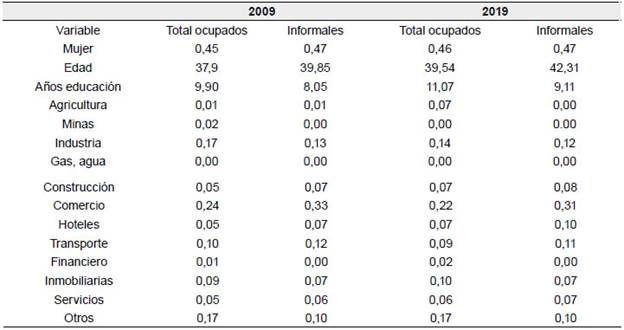 En la Tabla 2 se presentan algunas características generales de los ocupados y de los informales para las 23 ciudades y áreas metropolitanas en Colombia. Se observa en la tabla que para el 2009, el 45 % de los ocupados en el país eran mujeres. La edad promedio de los ocupados era de 38 años y tenían 9,9 años promedio de educación. Los sectores que más concentraban el empleo fueron el comercio, la industria, el transporte y las actividades inmobiliarias. En el caso de los informales, el 47 % eran mujeres, tenían cerca de 40 años de edad y 8,0 años promedio de educación. Por sectores económicos, el comercio (33 %), la industria (13 %), el transporte (12 %), la construcción (7 %) y las actividades inmobiliarias (7 %) concentran la mayor parte de los informales. Por tanto, en 2009 el perfil de los trabajadores informales era el siguiente: principalmente mujeres, con edades mayores que el promedio de los ocupados y niveles de educación menores que el promedio de los ocupados.