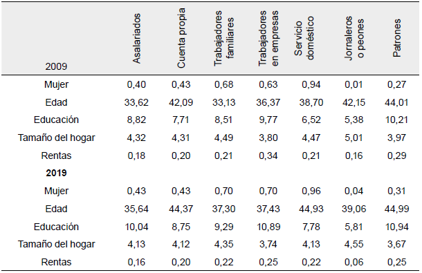 Considerando la posición ocupacional, en la Tabla 3 se presentan los promedios de algunas características sociodemográficas de los informales en Colombia para el 2009 y el 2019. Como se observa, para el 2009 la distribución de la informalidad por sexo está bien marcada en las diferentes categorías. En el caso de asalariados, cuenta propia, jornaleros y patrones, más del 57 % de los informales son hombres. En contraste, las categorías de trabajadores familiares, trabajadores en empresas y servicio doméstico están mayoritaria-mente conformadas por mujeres. Este resultado está en consonancia con lo planteado por Guataquí et al. (2010) y Ramírez (2015).