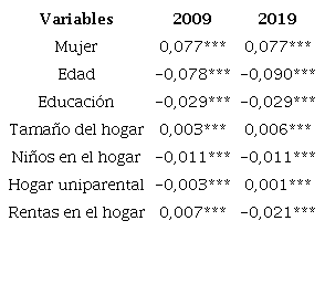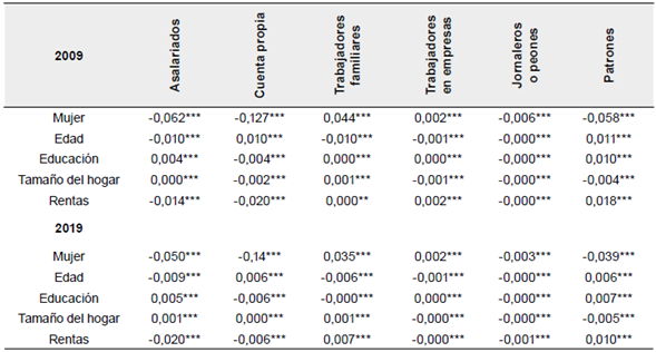 Los resultados del logit bivariado sugieren que en el 2009 ser mujer, pertenecer a hogares grandes y a hogares perceptores de rentas no laborales incrementaba la probabilidad de ser informal, mientras que la edad, la escolaridad, la existencia de menores en el hogar y pertenecer a hogares uni-parentales reducía dicha probabilidad. Para el 2019, el efecto de ser mujer no varía, mientras que el efecto del tamaño del hogar aumenta y el del hogar uni-parental cambia de negativo a positivo. En esta misma línea, el efecto marginal de la escolaridad y de los niños en el hogar no varía, en tanto que el de la edad aumenta en valor absoluto y el de las rentas cambia de positivo a negativo. Los efectos marginales cambian de signo en la medida en que se estiman modelos multinomiales que consideran las diferentes posiciones ocupacionales. Ser mujer, por ejemplo, aumenta la probabilidad de ser trabajador familiar y trabajador en empresa informal, pero la reduce en las demás categorías.