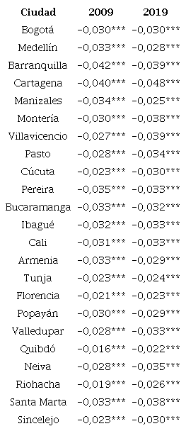 Finalmente, este artículo presenta evidencia sobre la relación entre la educación y la informalidad. Los resultados econométricos muestran que la educación en el 2009 reduce la probabilidad de ser informal en todas las ciudades, con importantes efectos en Barranquilla, Cartagena, Pereira y Manizales (efectos marginales mayores o iguales a 3,5 puntos porcentuales). Para el 2019, este efecto es mayor en Cartagena, Barranquilla, Villavicencio, Santa Marta y Montería (efectos marginales mayores o iguales a 3,8 puntos porcentuales). Al parecer, el efecto positivo de la educación sobre la informalidad a nivel local podría explicar la reducción en las brechas regionales de informalidad.