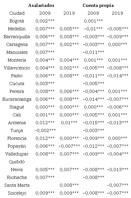 En el anexo 2 se presentan los efectos marginales de la educación para las categorías de asalariados y cuenta propia en ciudades. Los resultados sugieren un efecto marginal positivo en el caso de los asalariados, principalmente en Armenia y Florencia, y efectos negativos en los cuenta propia, especialmente en Armenia, Bucaramanga y Popayán. La Figura 8 presenta las variaciones absolutas de los coeficientes durante el periodo. En el panel izquierdo de esta figura se aprecia que el efecto positivo de la educación sobre la informalidad cae en general en el tiempo. Por su parte, en el panel derecho se observa que en ciudades como Barranquilla, Villavicencio, Neiva e Ibagué, el efecto de la educación es ahora mucho más negativo, mientras que en el resto de las ciudades el efecto marginal pasa de negativo a positivo, lo que indica que, en el caso de los cuenta propia, la educación en una parte importante de las ciudades aumenta la probabilidad de ser informal.