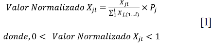 , multiplicada por la ponderación porcentual del criterio j(Pj). La ecuación detallada hace que el valor normalizado del criterio j para la alternativa l sea mayor que 0 y menor que 1; estas restricciones se justifican porque Xjl siempre será menor que