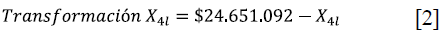 La transformación de los valores del criterio 4, para cada una de las alternativas, sigue la Ecuación 2. Por ejemplo, la transformación del valor del criterio 4 para la alternativa / se opera como la resta del valor máximo del criterio 4 (24 651 092 pesos, que es el correspondiente para la alternativa 8: canchas de Santillana) menos su respectivo valor.