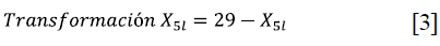 En el criterio 5 la transformación de los valores para cada una de las alternativas se fundamenta en la Ecuación 3. Por ejemplo, la transformación del valor del criterio 5 para la alternativa / se calcula como la resta del valor máximo del criterio 5 (29 establecimientos comerciales formales cercanos, que es el correspondiente para la alternativa 1: Parque Principal) menos su respectivo valor.