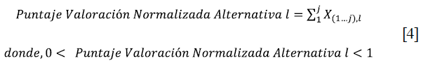 Después de la normalización de los valores de los criterios de decisión se aplica la Ecuación 4, con el fin de calcular el puntaje de valoración normalizada para cada alternativa. La ecuación para la alternativa / corresponde a la sumatoria de los valores normalizados de todos los criterios que hacen parte de la misma alternativa -del 1 al