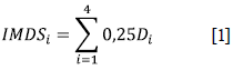 Las variables detalladas en la tabla anterior fueron utilizadas para la construcción del Índice Multidimensional de Desarrollo Sostenible (IMDS), el cual se definió como un índice de ponderaciones de distribución uniforme, cuya unidad de análisis son las UPA del cultivo agroindustrial de la palma de aceite en Norte de Santander. En este sentido, el IMDS estima el nivel de desarrollo sostenible para cada UPA del cultivo agroindustrial de la palma de aceite en Norte de Santander, a partir de las cuatro dimensiones del desarrollo sostenible (Di), cuya expresión es: