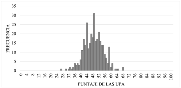El promedio de las calificaciones de IMDS de las UPA palmicultoras de Norte de Santander fue de 48,04 puntos de 100 posibles, cifra poco alentadora si se tiene en cuenta que gran parte de las UPA no logra llegar al punto centro de la distribución del índice de 50 puntos; además, el 48.8 % de las UPA no alcanzó la calificación promedio. Asimismo, al observar la distribución de la calificación cuantitativa del IMDS en la Figura 1, se puede apreciar cómo la mayoría de las UPA (71 %) se concentran en las calificaciones de entre 41,6 y 54,53 puntos, con una máxima calificación de 67,7 y un mínimo de 26,7 puntos.