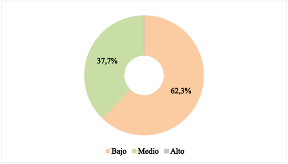 Por otra parte, en la escala de valoración cualitativa el índice resalta que la actividad se lleva a cabo en escenarios con bajos niveles de desarrollo sosteni-ble para Norte de Santander; en primer lugar, porque ninguna de las UPA palmicultoras en todo el departamento obtuvo un IMDS alto, tal como lo detalla la Figura 2; y, en segundo lugar, porque gran parte de las UPA se concentran en desempeños bajos (62.3 %).
