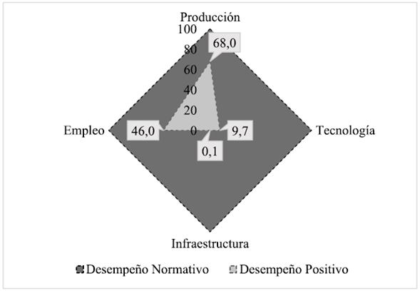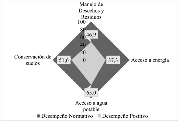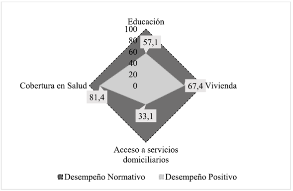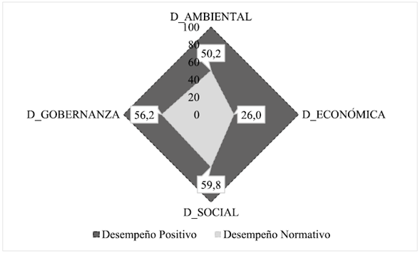 La desagregación del IMDS por dimensiones permite apreciar de forma más detallada los resultados, esto es, captar qué dimensiones en particular inciden sobre el resultado global. La Figura 3 detalla los resultados por dimensión, diferenciando el desempeño positivo (puntaje calculado de la dimensión en el IMDS) y el desempeño normativo (máxima calificación posible 100 puntos en cada dimensión), lo cual indica que dicha dimensión ofrece un escenario ampliamente favorable para los propósitos del desarrollo sostenible.