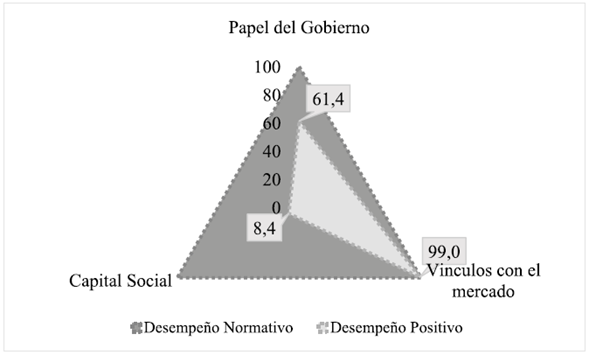 Por otra parte, la segunda dimensión de mayor calificación es la dimensión de gobernanza (56,2 puntos), donde se presenta que la variable de mejor desempeño es el vínculo con el mercado, pues todas las UPA manifestaron acceso al sistema financiero. Frente al papel del Gobierno, el mejor resultado lo obtiene la inexistencia de dificultades para acceder al agua por parte de instituciones, personas particulares o por falta de infraestructura; sin embargo, las UPA palmicultoras claramente no han logrado construir un capital social sólido, debido a su escasa participación en actividades de trabajo colectivo (ver Figura 5).