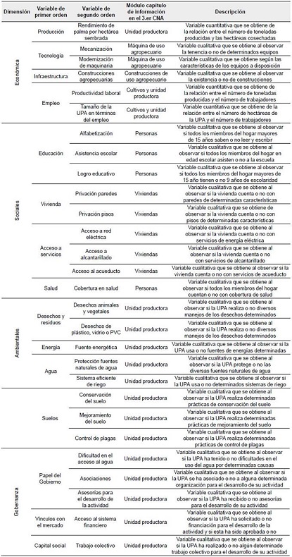 Para lo anterior, se tomaron como fuente de información los microdatos anonimizados del 3.er Censo Nacional Agropecuario (CNA) realizado por el Departamento Administrativo Nacional de Estadística (DANE), acorde con los módulos y variables señalados en la Tabla 1, los cuales se desagregaron teniendo en cuenta las cuatro dimensiones del desarrollo sostenible.
