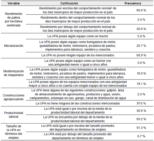Los hallazgos más críticos para el sector palmicultor están relacionados con el desempeño económico, en donde se destaca la escasa presencia de infraestructura y tecnología moderna que permitan mejorar los niveles de productividad de la actividad. En este sentido, es preciso tener en cuenta que el tamaño de la UPA es una factor influyente en las decisiones de inversión de infraestructura y tecnología, dada la posibilidad de producir a gran escala con mayores rendimientos. Pero en Norte de Santander, pese a que el tamaño promedio de UPA palmicultoras (31,3 hectáreas) se encuentra por encima del promedio de las demás actividades agrícolas del departamento, está por debajo del tamaño promedio entre los cinco principales departamentos pro-ductores4 (44,7 hectáreas). Tal como lo exponen Pertuz y Santamaría (2014), la actividad palmicultora es sostenible económicamente para el gran empresario, dada la productividad y rentabilidad del cultivo. Lo anterior significa una desventaja para los productores de mediana y pequeña escala.