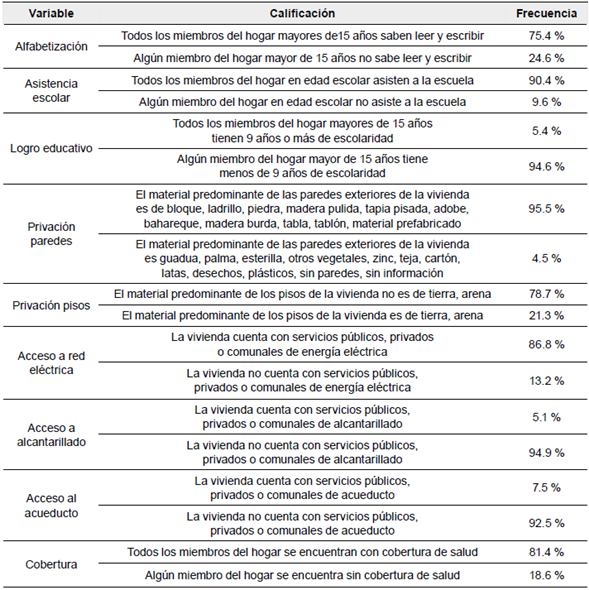 En la dimensión de inclusión social se incluyeron las variables de educación, vivienda, salud y acceso a servicios domiciliarios, y se encontró que de las 334 UPA palmicultoras del departamento, el 24.6 % señala que al menos una persona es analfabeta, dato preocupante pues el departamento tiene cifras en promedio de 12.9 % (DANE, 2018) (ver Tabla 3). Por otra parte, el 90.4 % de las UPA tienen a los niños y jóvenes en edad escolar asistiendo efectivamente al sistema educativo, cifra que evidencia una cobertura significativa; no obstante, el logro educativo promedio es bastante bajo, dado que el 94.6 % de los mayores de 15 años no superan los nueve años de escolaridad.