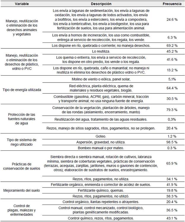 Respecto a la dimensión ambiental, la Tabla 4 detalla las principales características según las variables analizadas. Se observa que el 69.2 % de las UPA palmicultoras no realiza manejo de desechos, lo cual implica un desaprovechamiento de los residuos orgánicos y un mayor impacto de estos en el ambiente, de allí la importancia de una disposición adecuada. Por otra parte, el 86.8 % de los palmicultores manifiesta realizar algún manejo, reutilización o eliminación de desechos de plástico, vidrio o PVC, de los productos utilizados en las actividades; sin embargo, la quema o entierre (41.6 %), que es una práctica altamente contaminante, sigue siendo bastante frecuente.