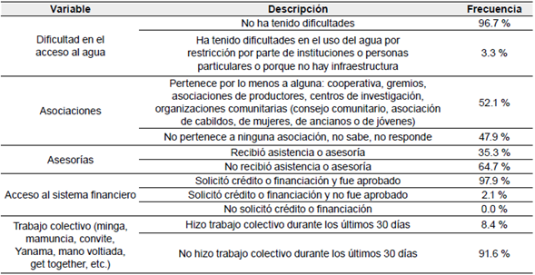 Finalmente, en la dimensión de gobernanza se analizó el papel del Gobierno, como el encargado de garantizar las condiciones que permitan el pleno desarrollo de la actividad agrícola; así como también el papel de las mismas empresas o en este caso de las unidades productivas, para promover conexiones y redes entre actores. En este sentido, el acceso al agua es un elemento fundamental, en donde solamente el 3.3 % de las UPA manifestaron haber tenido dificultades por restricción por parte de instituciones, personas particulares o por la ausencia de infraestructura (ver Tabla 5).