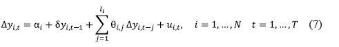 where yi,t is one of the variables (as described above) for stock i at period t, t, Δyi,t = yi,t- yi,t-1 and εi,t is an against the alternatives error term. Thus, we test the following null hypothesis of unit roots