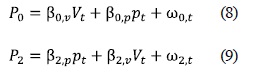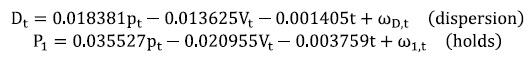 where ω0,t and ω2,t follow a stationary process and P0, P2, Vt and pt are defined as above. If analysts' recommendations are consistent with their estimated losses, then β0,v >0; β 0,p < 0; β2,p > 0; β2,V < 0. After checking for this consistency and following the hypothesis that issuing sell recommendations is more costly, we analyze how dispersed are analysts when their estimated loses increase. To do this, we estimate the following cointegrating equations: